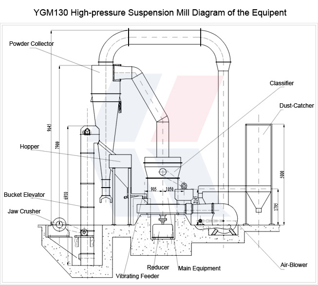 High-Pressure Suspension Mill Production Line is mainly consisted of jaw crusher,bucket elevator, hopper, vibrating feeder,grinder, air blower, powder collector, dust catcher.