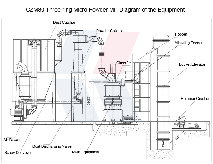 Three-Ring Micro Powder Mill Production Line mainly consists hammer crusher ,bucket elevator, hopper, vibrating feeder ,grinder, high pressure blower, powder collector, pulse dust collector and so on.